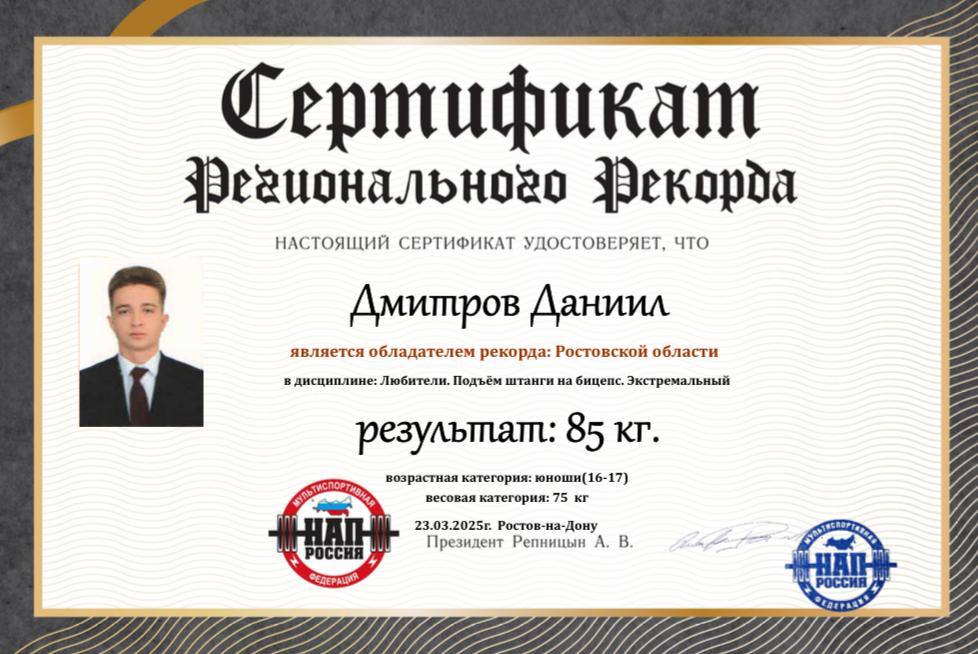 Старшеклассник Даниил Дмитров из поселка Каменоломни Октябрьского района стал обладателем нового рекорда Ростовской области в пауэрлифтинге.