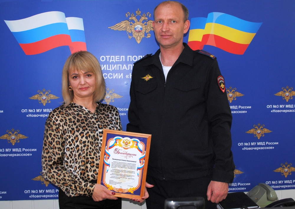 За проявленную бдительность врио начальника межмуниципального отдела полиции №3 МУ МВД России «Новочеркасское», подполковник Сергей Платонов вручил Елена Крайненко благодарность от ведомства.