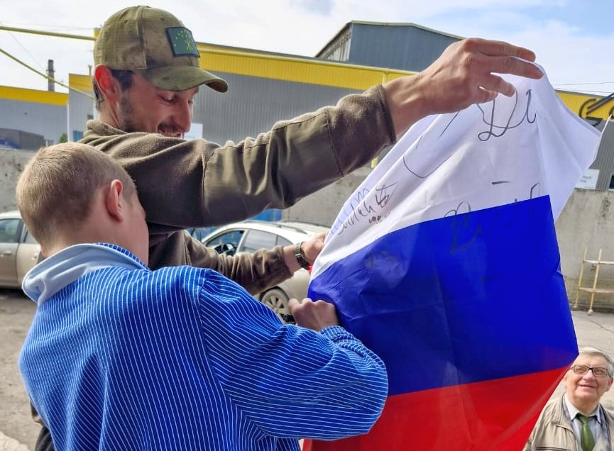Провожали волонтеров все, у кого были силы самостоятельно спуститься и стоять на ногах. Ребята с радостью подписали флаги для детей из детского сада и школьников, которые волонтеры привезли с собой, и сделали общее фото на память.