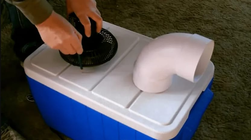 - Включите устройство. Вентилятор будет втягивать горячий воздух, который будет охлаждаться, проходя рядом с бутылками со льдом, а затем холодный воздух будет выходить через трубу.