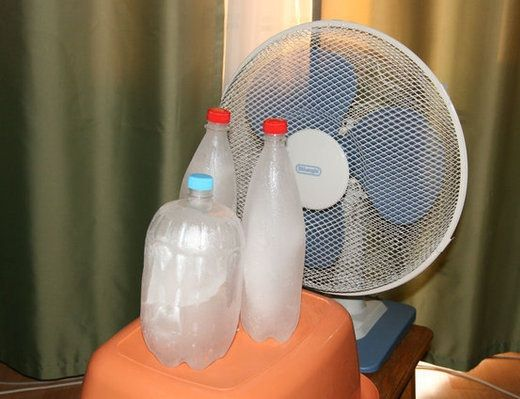 Установите перед вентилятором миску со льдом или бутылку с замороженной водой. Проходя мимо, воздух охлаждается и распространяется по комнате. Ещё проще — обложите вентилятор снегом или льдом, создав искусственный «холодильник».