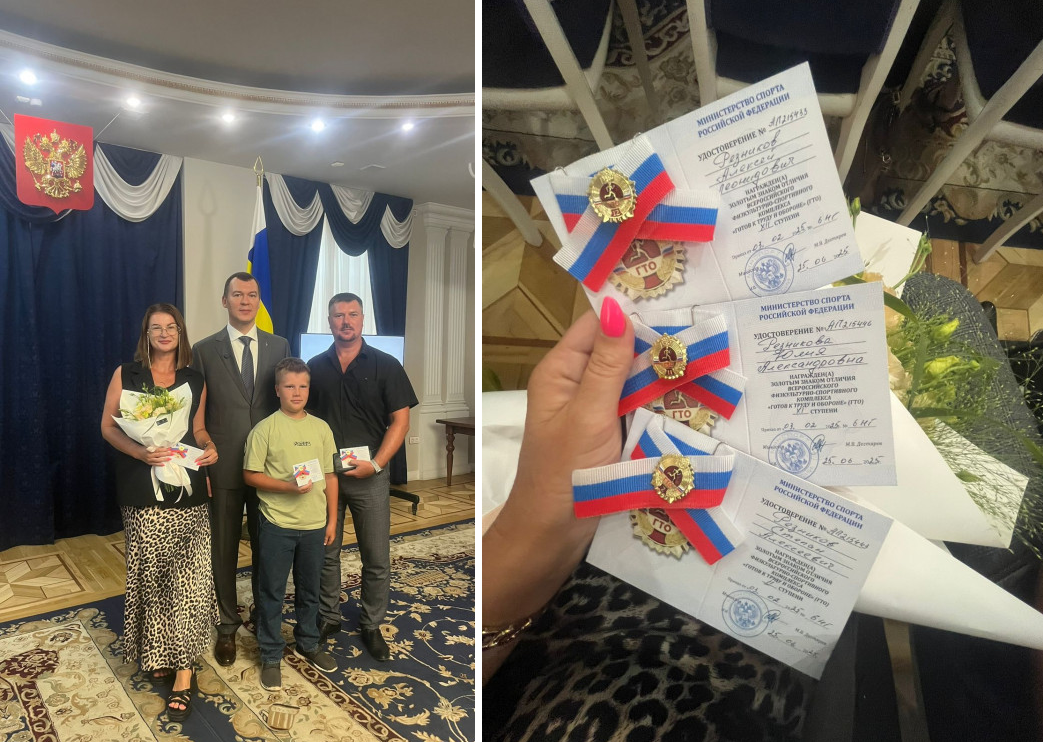 Министр лично вручил Юлии, Алексею и их сыну Степану золотые знаки отличия ВФСК ГТО. Резниковы – активные участники спортивных мероприятий не только районного и областного, но и всероссийского уровня. Напомним, в том году они показала отличные результаты в «Семейном пенальти» и стала бронзовыми призерами областных соревнований. Семья активно занимается спортом и показывает высокие результаты в выполнении нормативов комплекса «Готов к труду и обороне», подавая отличный пример здорового образа жизни.