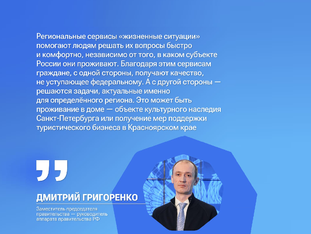 Как отмечает куратор проекта, заместитель председателя правительства Дмитрий Григоренко разные «жизненные ситуации» помогают людям решать вопросы прежде всего быстро и комфортно. Работа по формированию и запуску сервисов ведется в рамках реализации федерального проекта «Государство для людей».