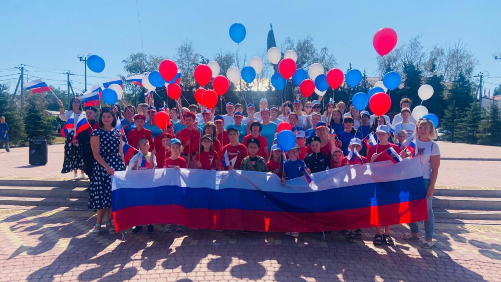 Участники, одетые в цвета российского флага — футболки белого, синего и красного цветов, держа в руках флажки и воздушные выстроились в живой триколор.