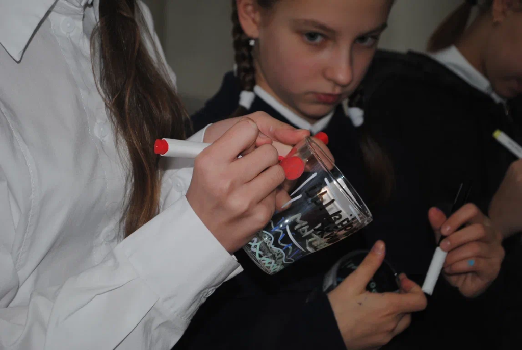 В ходе церемонии награждения в РДК прошло еще одно важное мероприятие. Ребята под руководством педагога средней школы №61 Элеоноры Ивановской раскрасили кружки, которые, вместе с их поделками, будут переданы российским бойцам, находящимся в зоне проведения специальной военной операции.