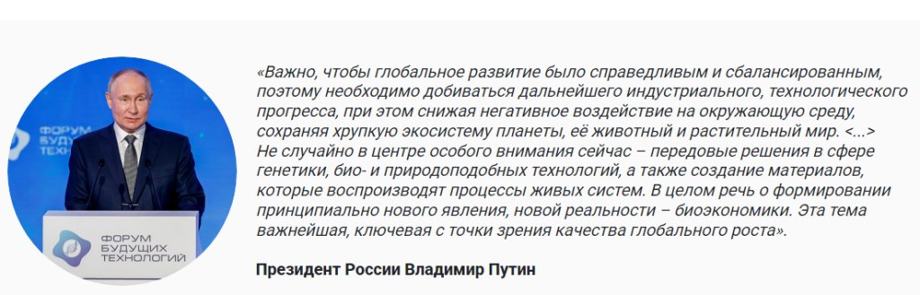 – В этом году стартовал один из самых наукоемких нацпроектов технологического лидерства – «Биоэкономика». Россия в числе мировых лидеров по объему возобновляемых биоресурсов. У нас отличные стартовые позиции, есть все необходимые компетенции, уникальные научные разработки. Именно биоэкономика будет главной темой Форума будущих технологий, – заявил Дмитрий Чернышенко.