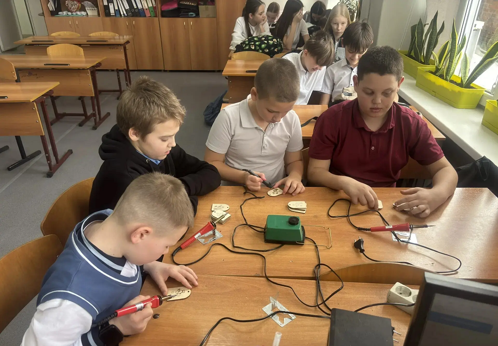В школе есть особое место памяти – стенд с фотографиями защитников. Я зашла в третий класс, где работает удивительный педагог – Наталья Мозговая. Здесь находится «Парта героя», украшенная детскими поделка ми. Эти работы ребята сделали в память о Жене Дьяченко, выпускнике школы, героически погибшем 15 октября 2024 года на Кураховском направлении.