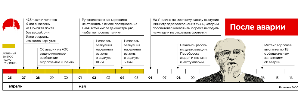 В ночь с 25 на 26 апреля 1986 года во время испытания турбогенератора на четвёртом энергоблоке ЧАЭС прогремели два взрыва (в 01:23 по мск), разрушивших реактор. Выброс радиоактивных веществ оказался в 400 раз больше, чем при бомбардировке Хиросимы. Опасные частицы разнеслись по территории современных Украины, Беларуси, России и Европе.