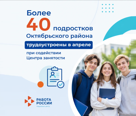 В апреле 2026 года при содействии Центра занятости населения района трудоустроены 44 несовершеннолетних октябрьца. Ребята занимались благоустройством и уборкой территорий.